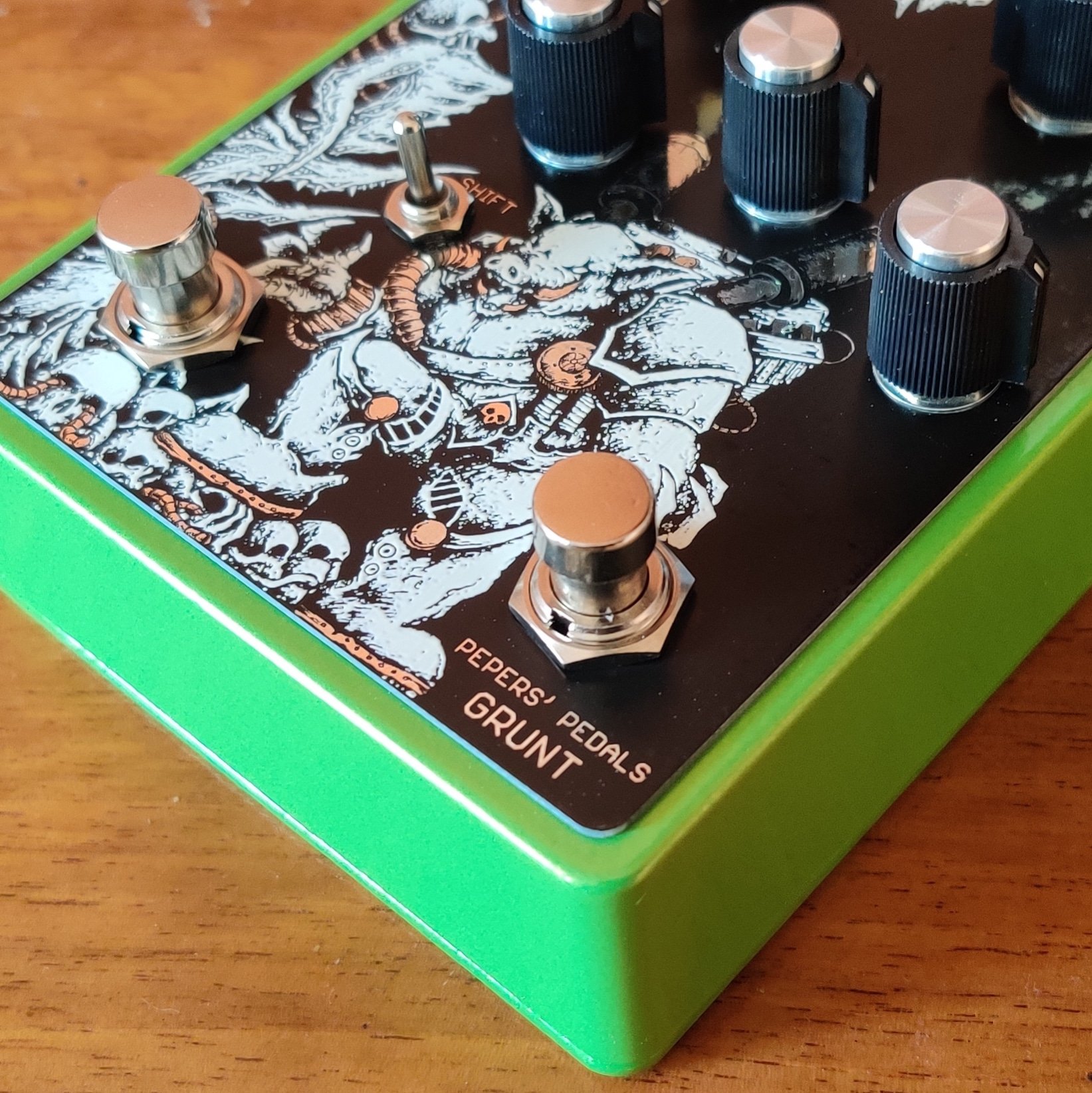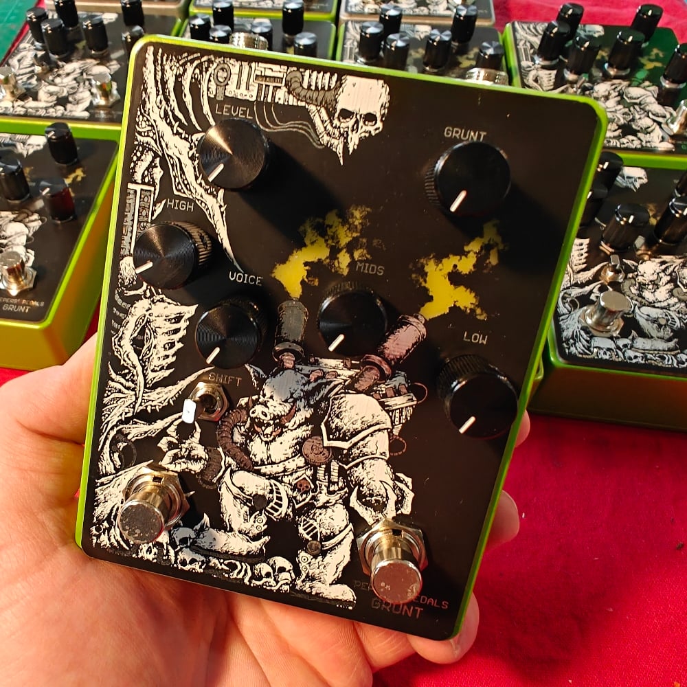 Grunt. Nothing but pure Grunt awaits with this high gain Jfet preamp. Featuring a full TMB tone stack with mids voicing and a footswitchable boost to add that little something extra, of course you can always feed your favourite overdrive or boost into Grunt.
