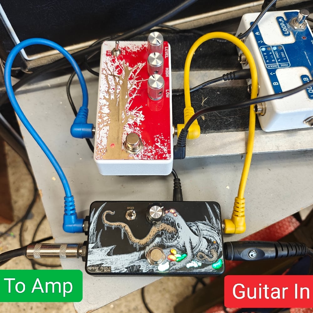 The Jelly bean should ideally be set up in the 4 cable method. It is designed so that it doesn't matter which jack you use for the send and returns as long as they are on the correct side. The right hand side is your input sense and send. the left hand goes to your effects loop. However it can be set up without an amp effects loop and can still kill noise as required.
