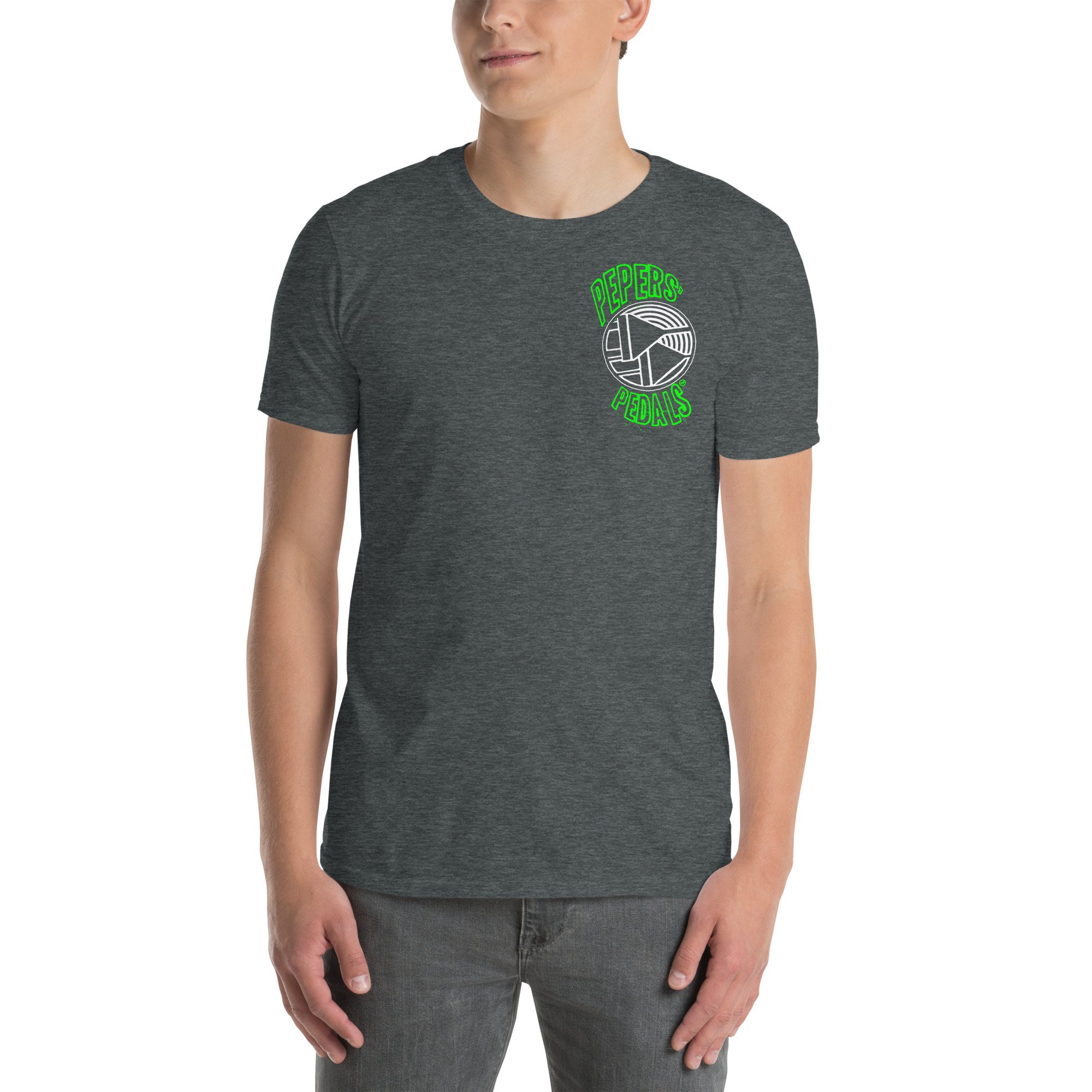 Show off your love for Pepers' Pedals with this classic logo t-shirt. Featuring the iconic Pepers' Pedals logo in green and white