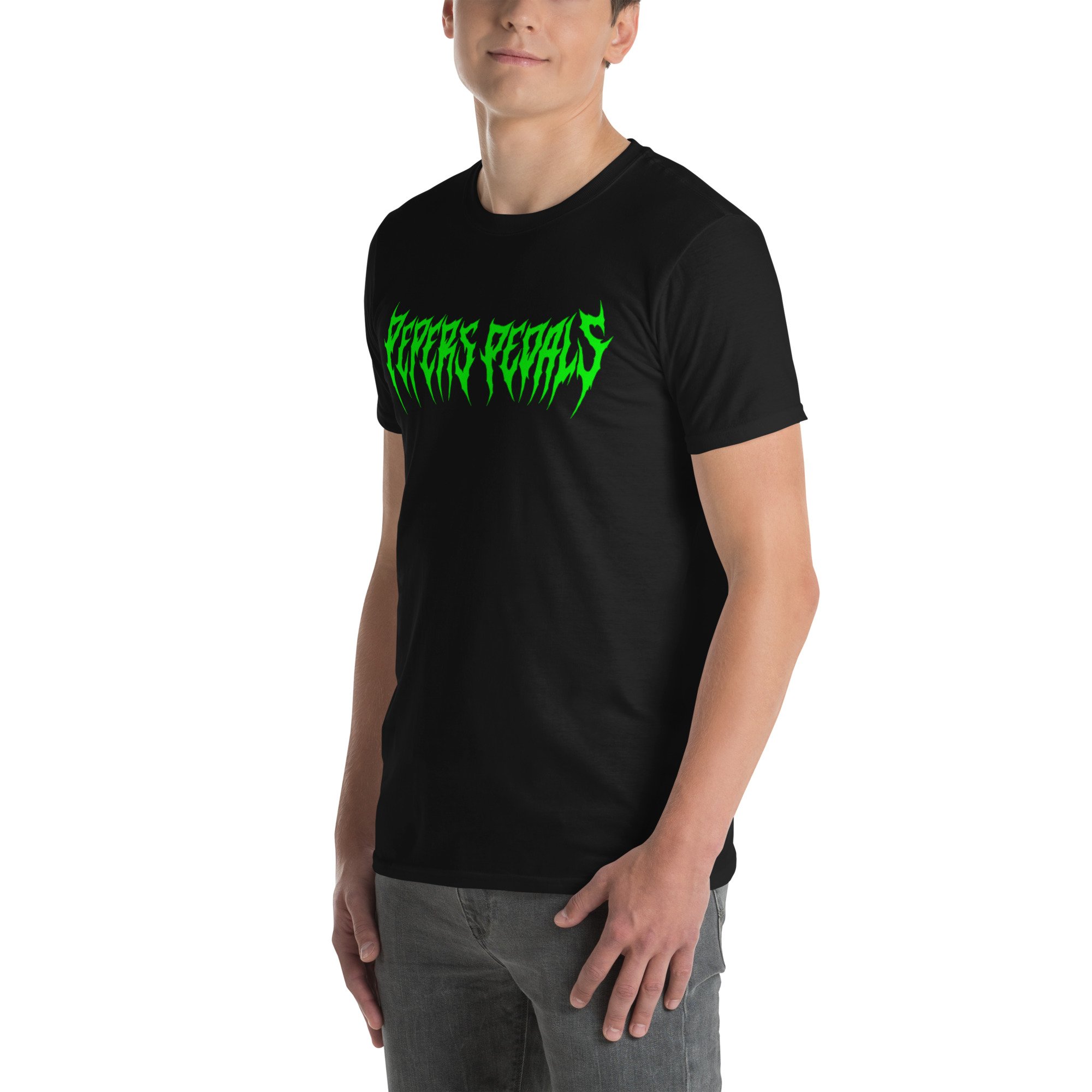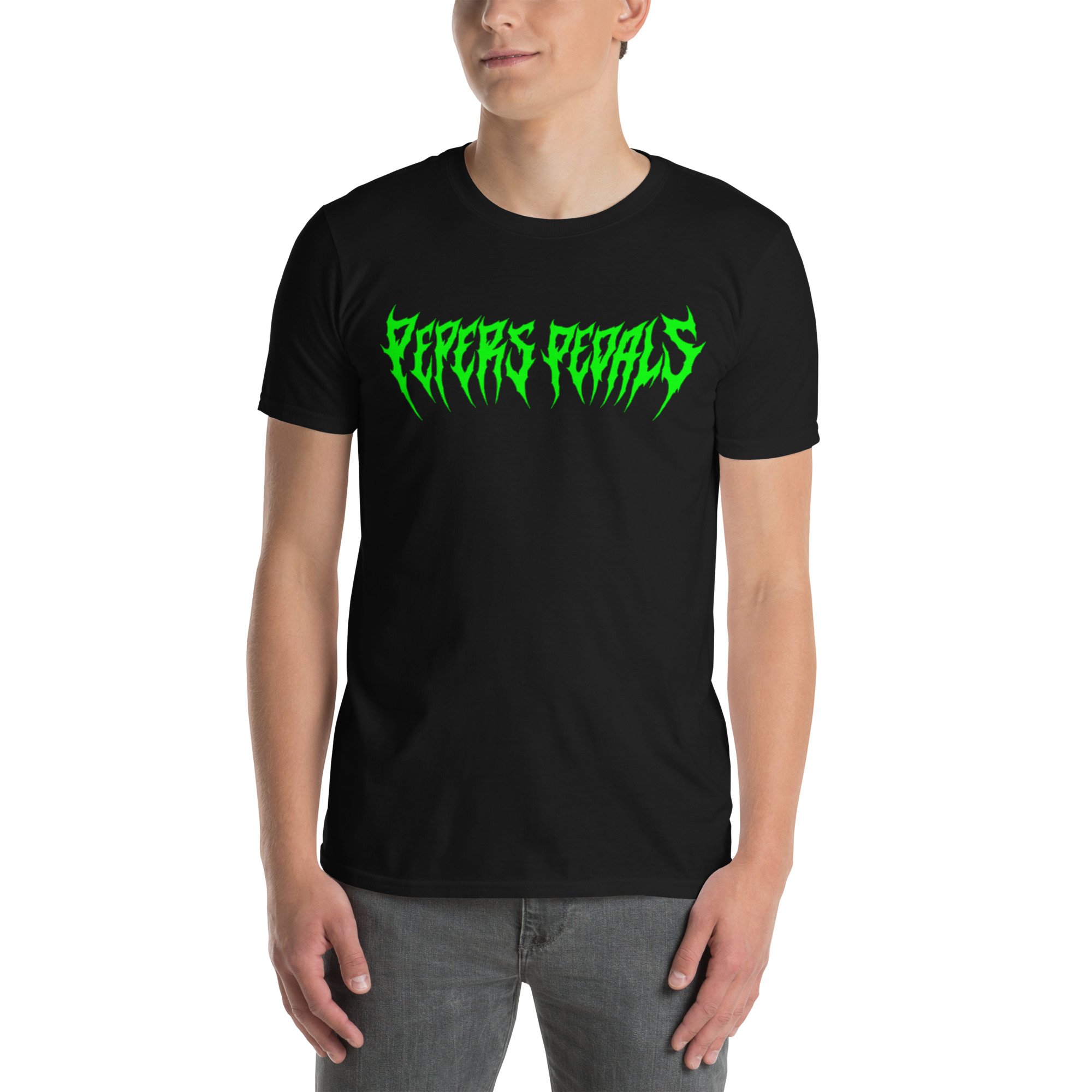 Show off your love for Pepers' Pedals with this Heavy Metal logo t-shirt. Featuring the new Pepers' Pedals Heavy Metal Logo in green